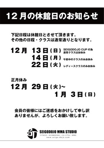 今年も残り少しですね。 皆さん、体調管理など気をつけながら今年を乗り切りましょう。 年末年始のスケジュールです。 よろしくお願いします。 今年は安全面を考慮して忘年会は行いません。 楽しみにして頂いた皆さん申し訳ありません。 後日、 SEIGODOJOの…
